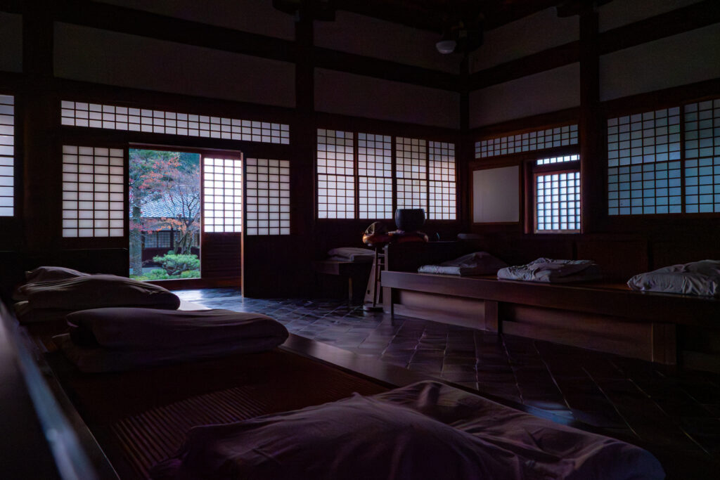 禅塾の建物は、昭和初期に建てられた木造建築です。月明りに浮かび上がる枯山水や禅堂、木々のシルエット。夜明け前、障子越しに差し込むやわらかな光。そうした静かな環境の中で一夜を過ごすことは、現代ではなかなか得がたい貴重な体験です。